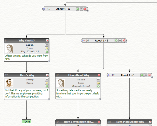 Group nodes are used to create sub-trees within the overall conversation tree. This is useful from an organizational standpoint but also becomes very valuable in defining conditions as you will see in defining condition priorities. Groups can be thought of as simplified dialogue nodes and contain some of the same fields. Group nodes can also be added, arranged, and linked just like dialogue nodes. As of Chat Mapper version 1.7, scripts defined on group nodes will be executed just like script assigned to dialogue nodes.